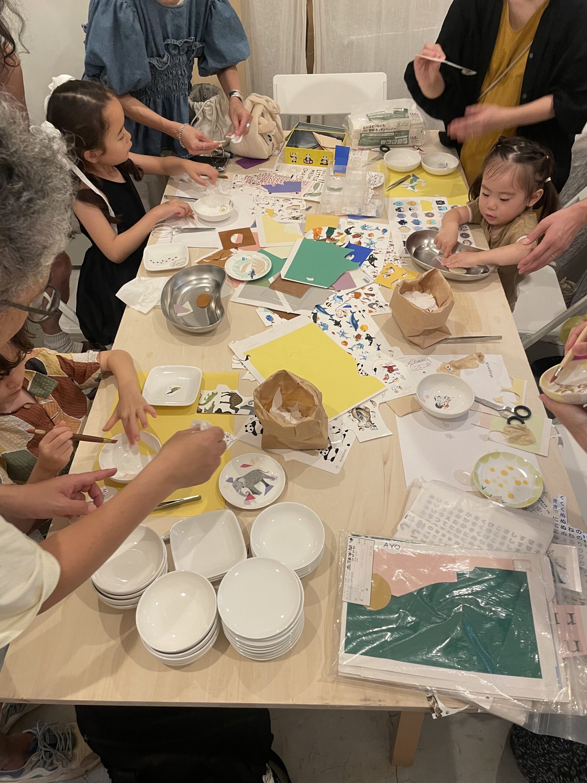 お皿にシールを貼って好きにデザインしていただけます。世界にひとつだけのオリジナルを作ってみてください。こども〜おとなまでご参加いただけます。※作成後、窯で焼き付けるため2週間程後に着払いでのご配送になります。